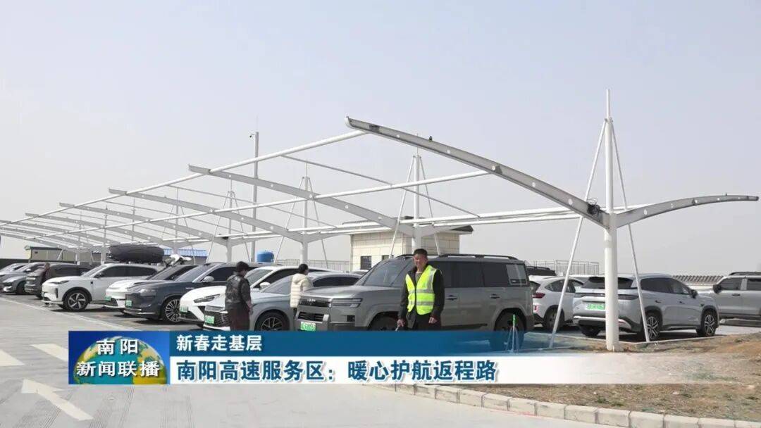 【南阳台记者 黄鑫:我现在是在南阳高速唐河南服务区。作为南阳东部重要的返程补给节点,这里同样迎来车流高峰。服务区实行分区引导、专人指挥,货车、客车、新能源车分区停放,有效解决高峰停车难、周转慢问题。】