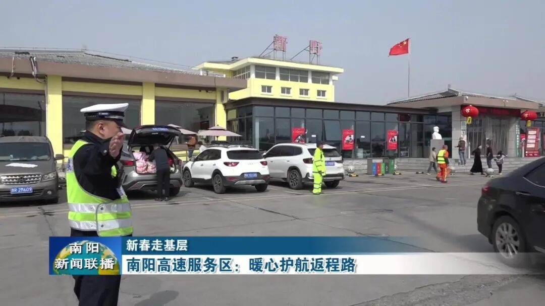 【南阳台记者 韩晓艳:我现在是在南阳高速新野服务区。可以看到,这里已经迎来春节返程高峰,车流密集,但是秩序井然,交警、路政和服务区工作人员正在一线值守,全力保障大家平安顺畅返程。】