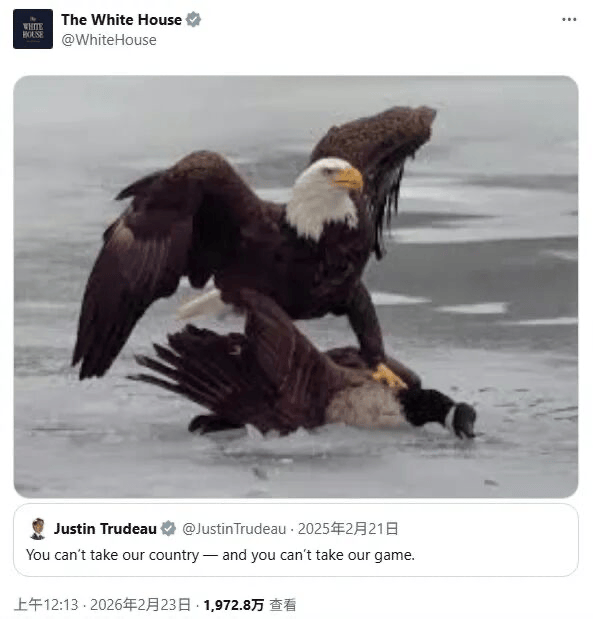 报道还称,白宫发布了一张显示白头鹰猛扑加拿大鹅的照片,回应一年前时任加拿大总理特鲁多在社交平台X上发布的一条帖子。特鲁多在帖子中写道:“你们夺不走我们的国家——也夺不走我们的国球。”