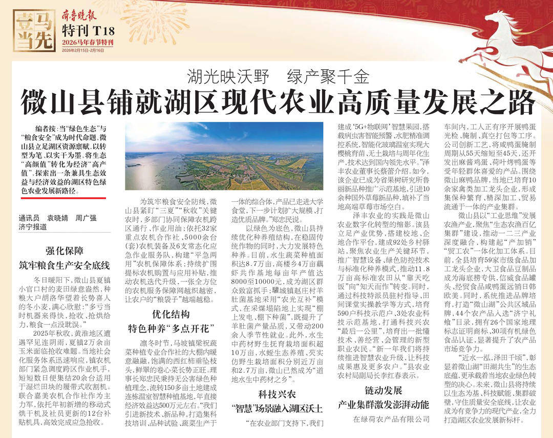 编者按:当“绿色生态”与“粮食安全”成为时代命题,微山县立足湖区资源禀赋,以转型为笔、以实干为墨,将生态“高颜值”转化为经济“高产值”,探索出一条兼具生态效益与经济效益的湖区特色绿色农业发展新路径。