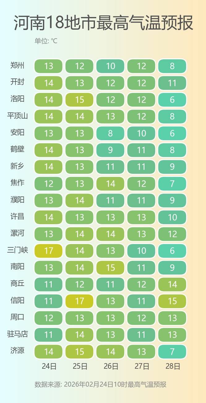 预计今起四天全省大部气温起伏不大,其中最高气温多在11-14度,最低气温3-6度。28日随着新一股冷空气扩散南下,气温将自西向东逐渐下滑,3月1日全省大部最高气温降至6-10度,公众需关注气温变化,注意防寒保暖。