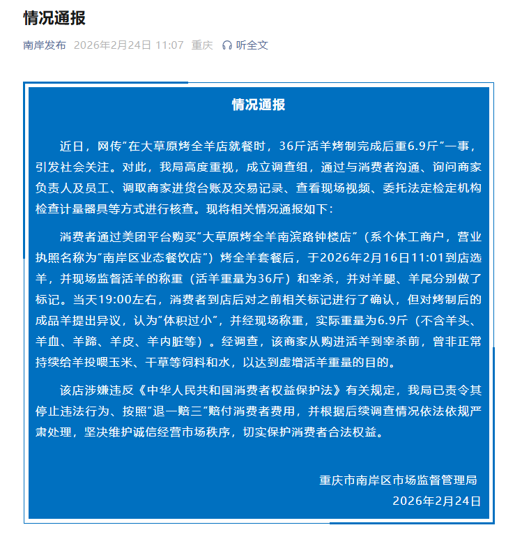 近日,网传“在大草原烤全羊店就餐时,36斤活羊烤制完成后重6.9斤”一事,引发社会关注。对此,我局高度重视,成立调查组,通过与消费者沟通、询问商家负责人及员工、调取商家进货台账及交易记录、查看现场视频、委托法定检定机构检查计量器具等方式进行核查。现将相关情况通报如下: