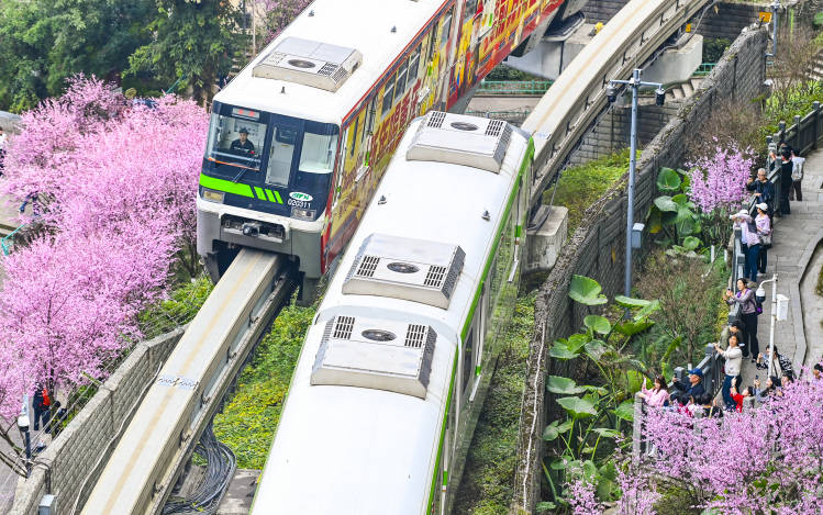 作为热门打卡地,每年二月春暖大地,重庆轨道交通2号线佛图关段“开往春天的列车”都会如约而至,沿线大片美人梅娇艳绽放,吸引了各地大量游客前来打卡感受重庆的美景。