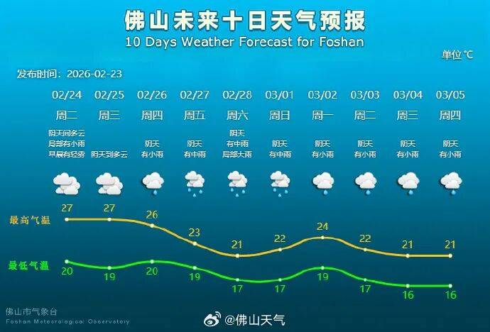 佛山天气预报,24日至25日多云为主,早晚有轻雾,间中局部有小雨,白天体感温暖;2月26日至3月2日有小到中雨,气温逐日缓慢下降,体感阴凉,需及时添衣;展望3月3日(元宵节)仍有小雨。