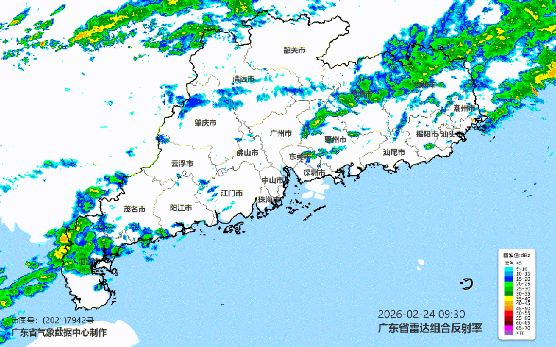 据广东天气预报,24日上午,湛江、东莞、梅州等市县有降雨云团活动。