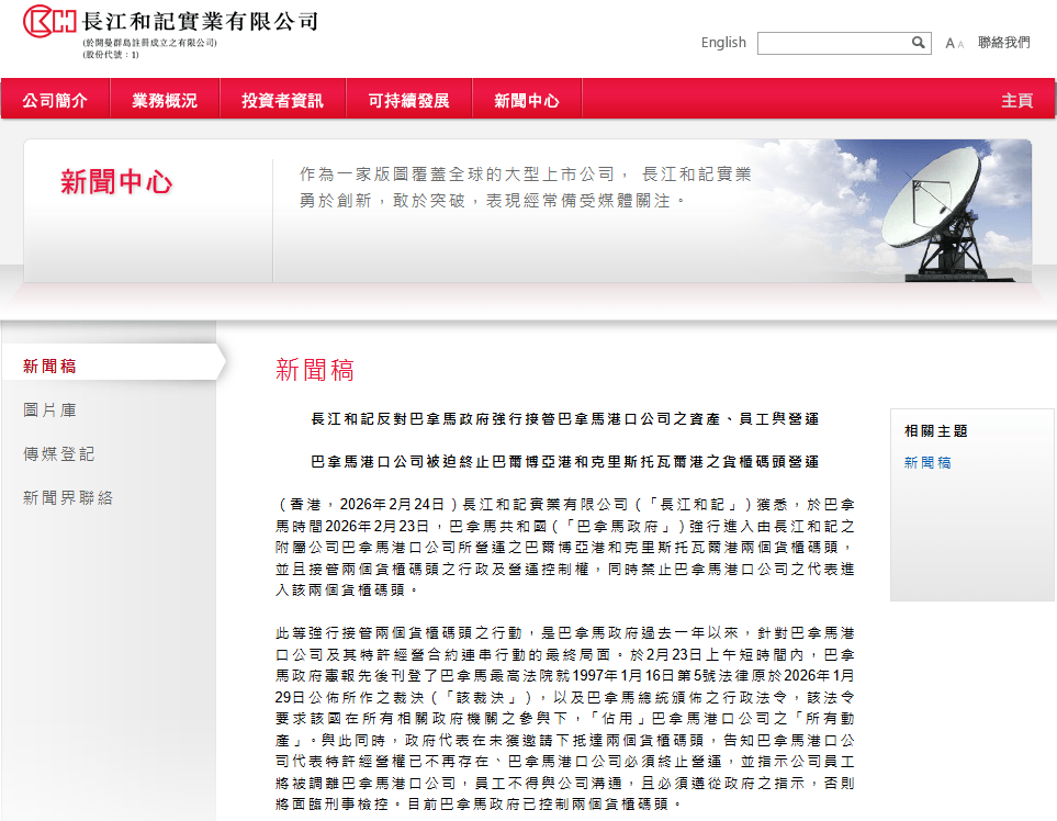 长江和记文中提到,巴拿马时间2026年2月23日,巴拿马共和国(以下称巴拿马政府)强行进入由长江和记附属公司巴拿马港口公司所营运之巴尔博亚港和克里斯托瓦尔港两个货柜码头,并且接管两个货柜码头行政及营运控制权,同时禁止巴拿马港口公司代表进入该两个货柜码头。