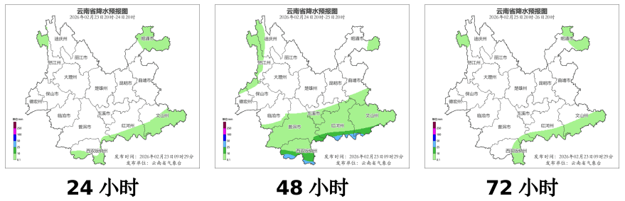 2月23日20时到2月24日20时:昭通市北部、文山州南部、红河州南部、普洱市东南部、西双版纳州南部、怒江州北部多云有阵雨,其他地区晴间多云。