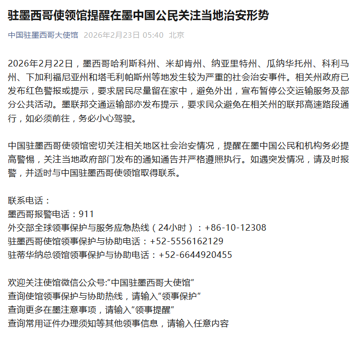 2026年2月22日,墨西哥哈利斯科州、米却肯州、纳亚里特州、瓜纳华托州、科利马州、下加利福尼亚州和塔毛利帕斯州等地发生较为严重的社会治安事件。相关州政府已发布红色警报或提示,要求居民尽量留在家中,避免外出,宣布暂停公交运输服务及部分公共活动。墨联邦交通运输部亦发布提示,要求民众避免在相关州的联邦高速路段通行,如必须前往,务必小心驾驶。