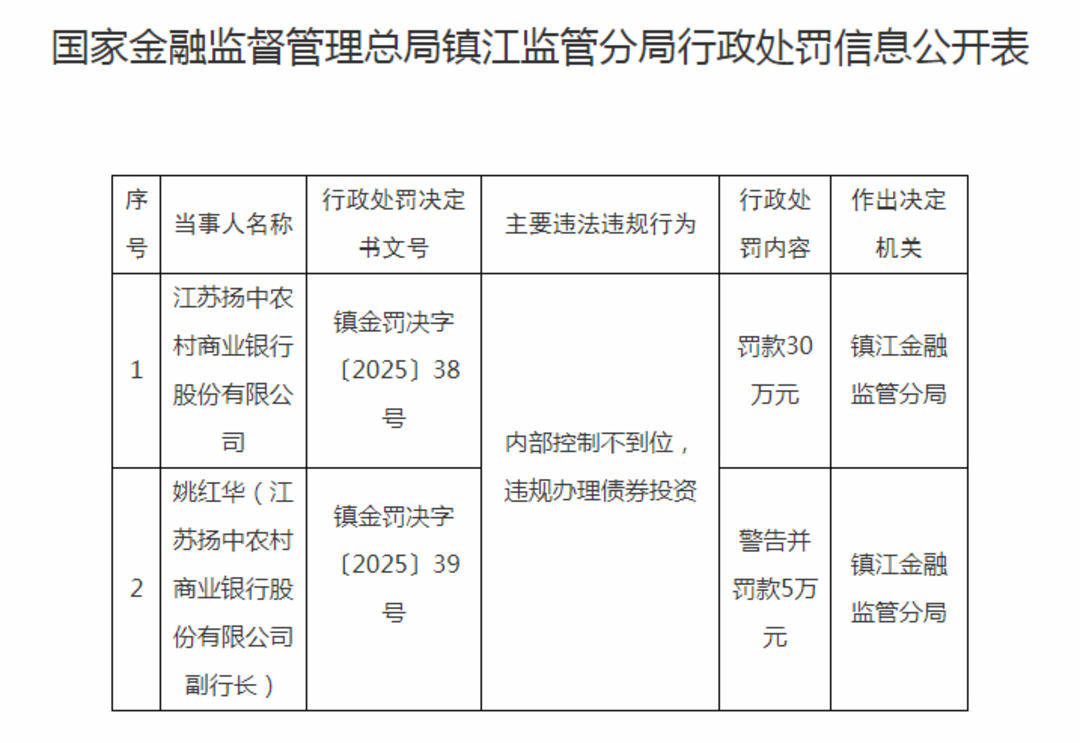 该处罚信息显示:江苏扬中农村商业银行股份有限公司及姚红华(江苏扬中农村商业银行股份有限公司副行长),均因“内部控制不到位,违规办理债券投资”这一违法违规行为,被镇江金融监管分局分别“罚款30万元”、“警告并罚款5万元”。