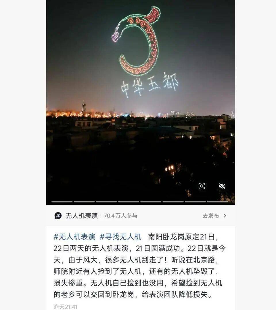 2月22日晚,河南南阳一景区无人机表演突遇阵风,部分无人机被吹散、掉落,引发网友关注。
