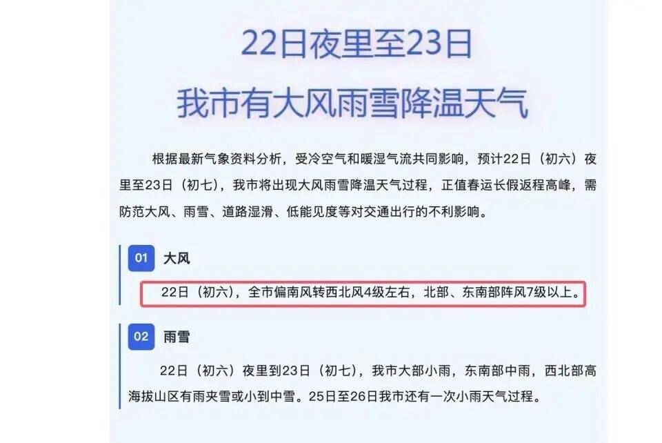 据南阳市气象部门22日白天发布的天气信息,受冷空气和暖湿气流共同影响,预计22日(初六)夜里至23日(初七),该市将出现大风雨雪降温天气过程。22日(初六),全市偏南风转西北风4级左右,北部、东南部阵风7级以上。