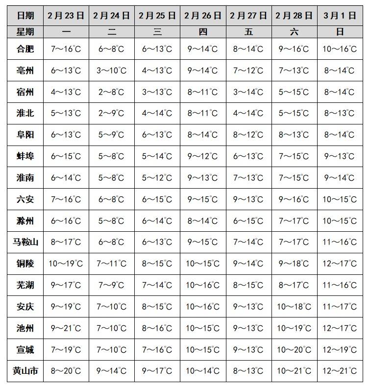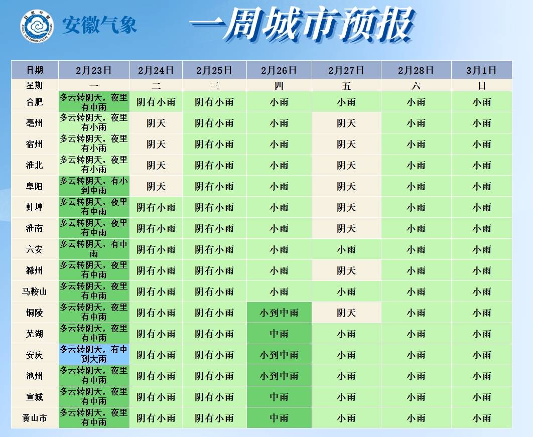 据安徽气象最新预报:未来一周安徽省多降水过程。26日(初十)沿江江南部分地区中雨。受冷空气影响,今明两天全省平均气温自北向南将下降5~8℃,同时全省平均风力3~4级,阵风7级。冷空气过后25日(初九)早晨最低气温:淮北地区3~6℃,江南南部8~10℃,其他地区5~8℃。24日(初八)后全省大部分地区最高气温低于16℃。