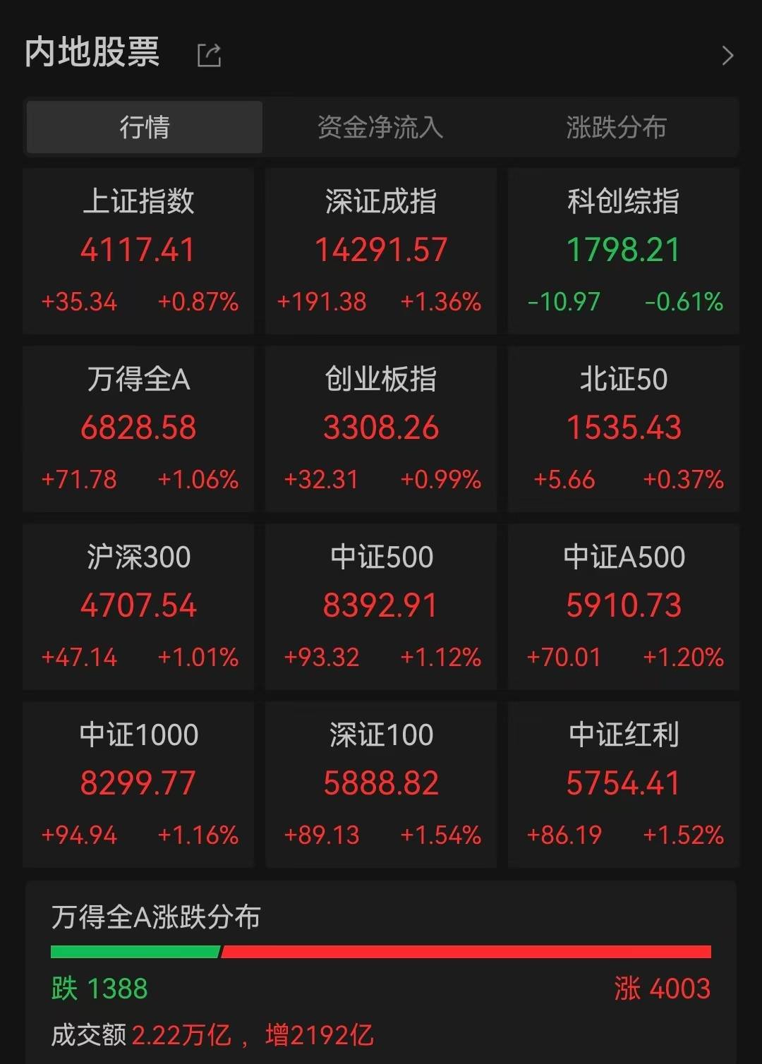 【大河财立方消息】2月24日,A股马年首个交易日收官,市场冲高回落。截至收盘,沪指涨0.87%,深证成指涨1.36%,科创综指跌0.61%,创业板指涨1.06%。沪深北三市成交额2.22万亿元,较上一个交易日放量2192亿元。