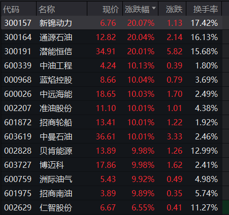 油气开采板块持续走强,新锦动力、通源石油、潜能恒信20CM涨停,中油工程、蓝焰控股、中远海能、淮油股份、招商轮船等多股涨停。