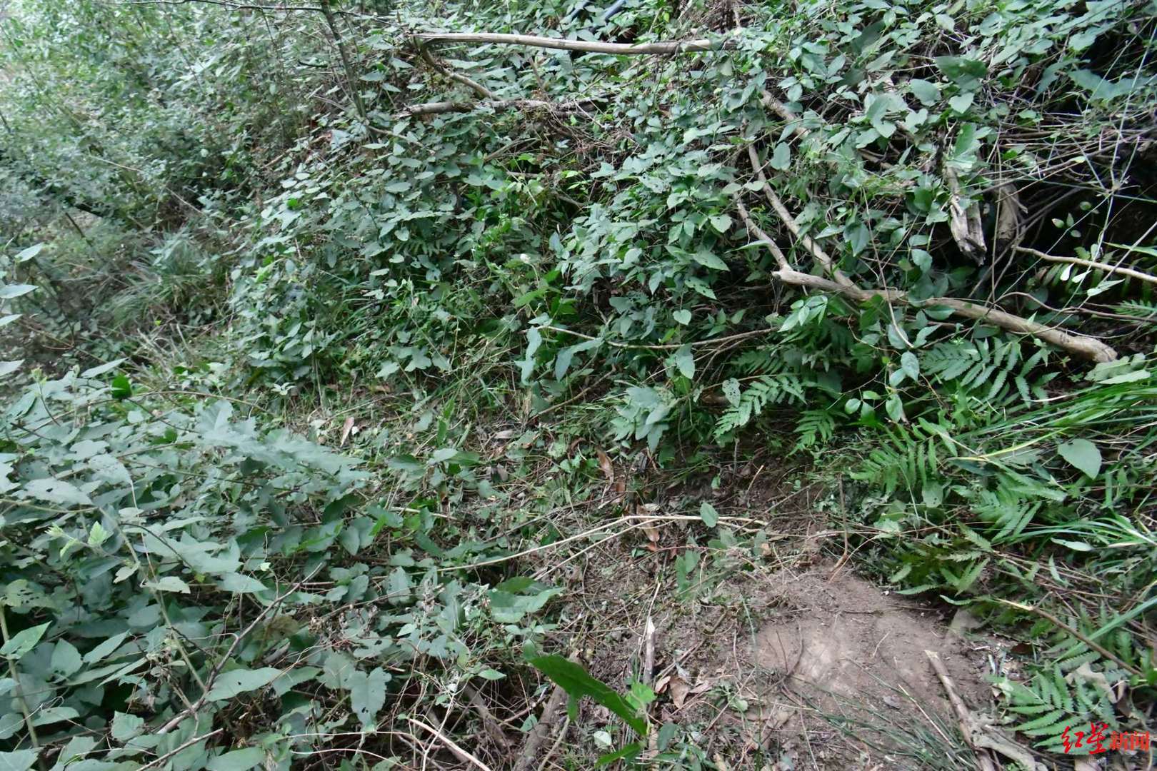 在半山腰,赵小玲和陈志明发现一只落在草丛中的白网鞋,经辨认,这只网鞋正是官开英走失前所穿。仔细观察后,他们发现网鞋周边的杂草和坡下落叶有重物压倒的痕迹。“坡上根本没有路,到处是荆棘,地上还有厚厚一层落叶,每走一步都很艰难。”村民徐自芬说。