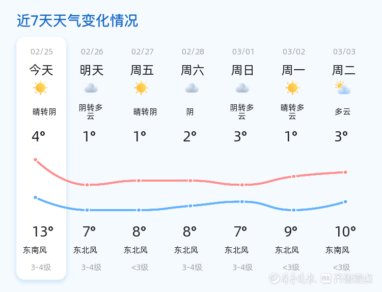 未来三天,东营市天气趋势以阴到多云为主,气温波动较大,最高气温13℃,最低气温1℃。建议市民根据天气变化及时调整衣物,防范感冒等疾病的发生。