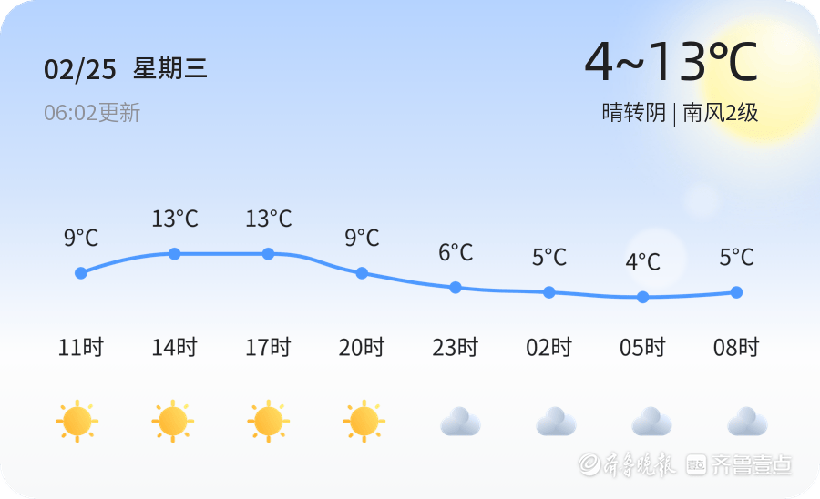 今天是2月25日,星期三,农历正月初九。东营市今日天气晴转阴,气温在4℃至13℃之间。各区天气状况基本一致,以晴转阴为主,南风2级,空气湿度为82%,PM2.5指数为58,空气质量良好。