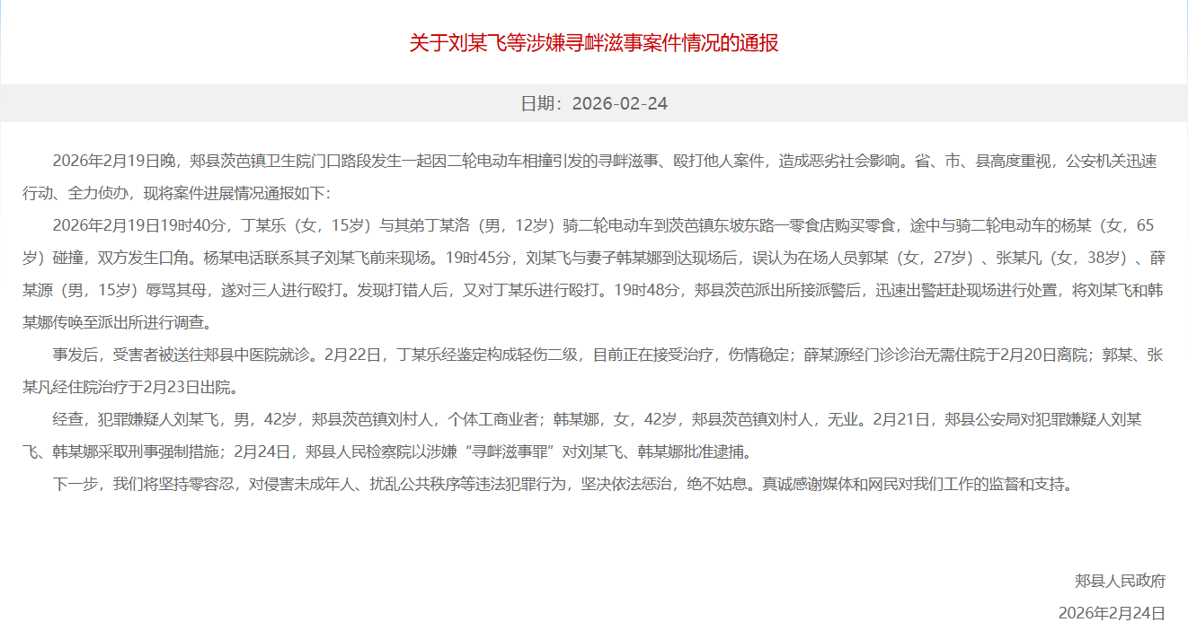 央广网北京2月25日消息 郏县人民政府网站2月24日发布“关于刘某飞等涉嫌寻衅滋事案件情况的通报”。通报称,2026年2月19日晚,郏县茨芭镇卫生院门口路段发生一起因二轮电动车相撞引发的寻衅滋事、殴打他人案件,造成恶劣社会影响。省、市、县高度重视,公安机关迅速行动、全力侦办,现将案件进展情况通报如下: