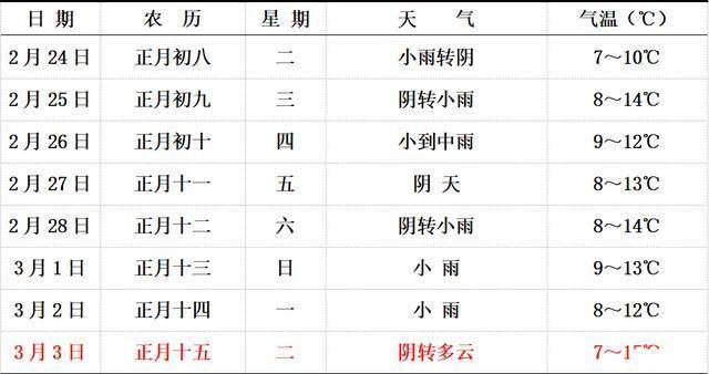 http://www.w3.org/1999/xhtml"}]">2月28日至3月3日(正月十二至十五):全省阴天到多云,其中沿淮淮河以南大部分地区有小雨。
