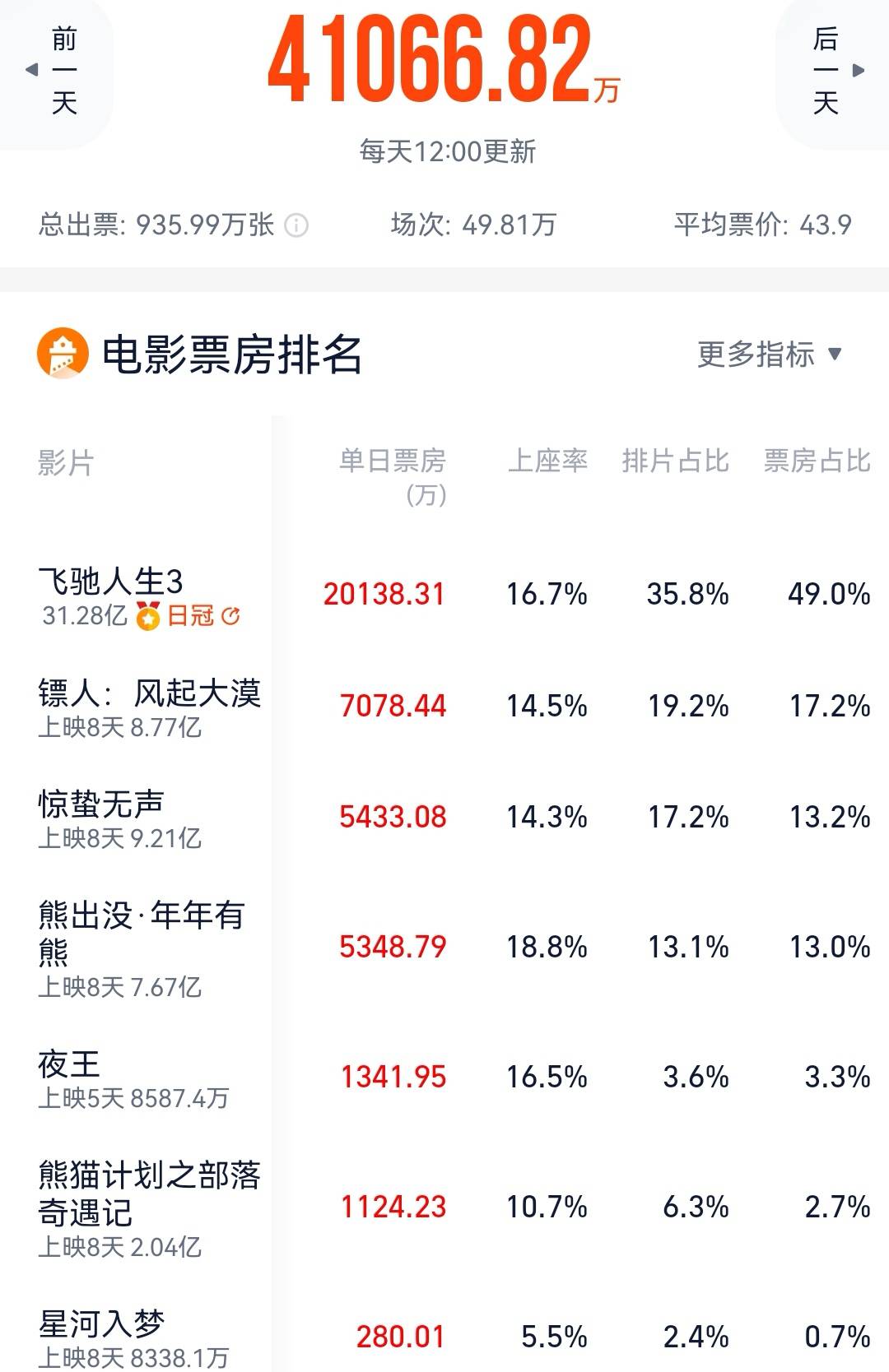 搜狐娱乐讯 (哈麦/文)2月24日,节后首个工作日,大盘票房4.1亿元,环比下跌34%,不到去年节后首个工作日8.7亿元的一半。