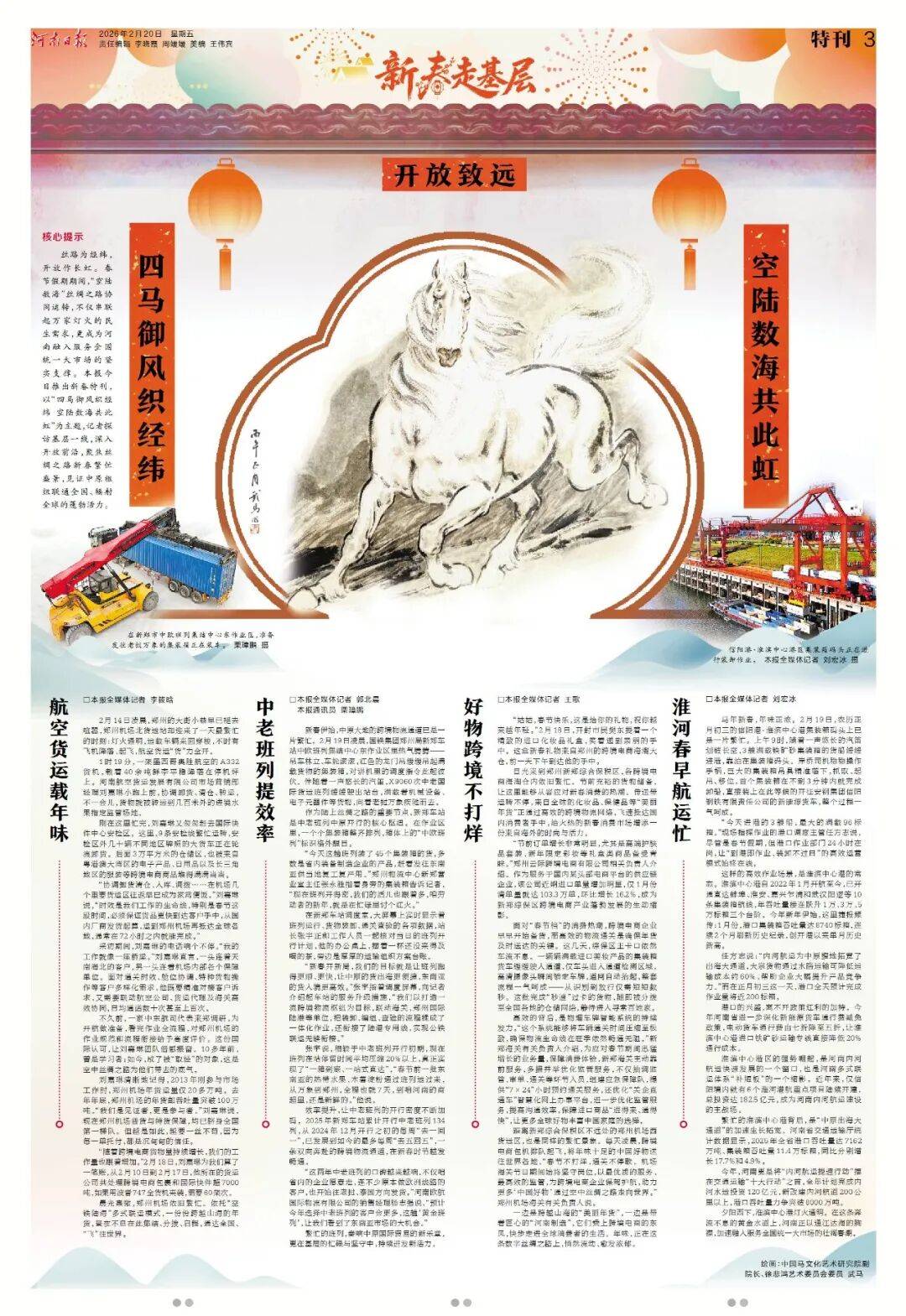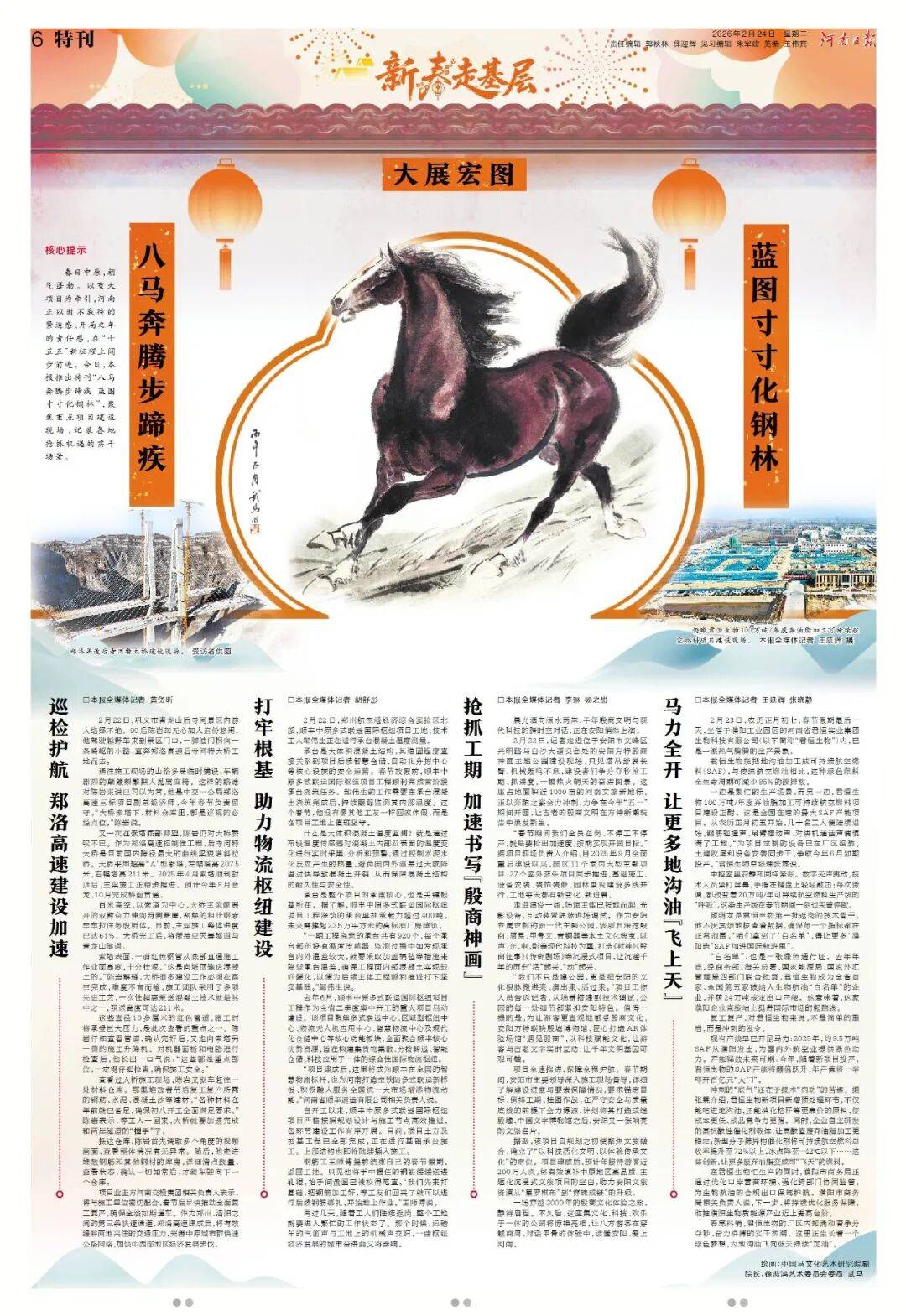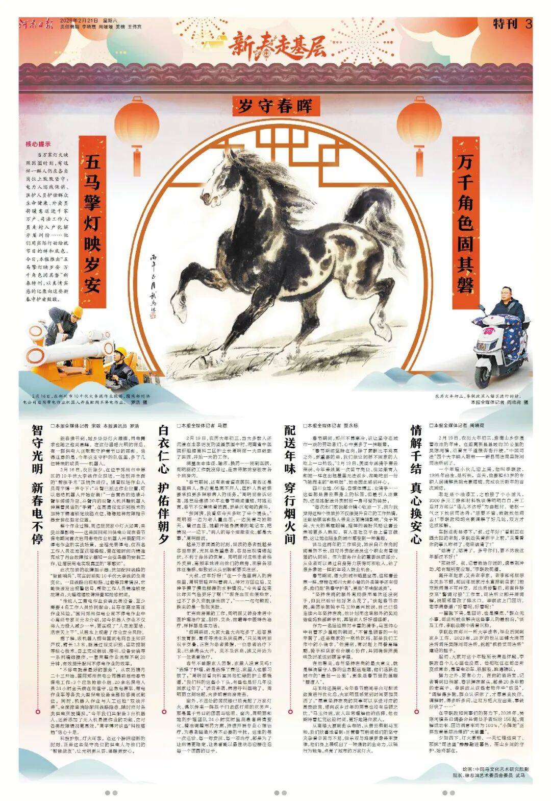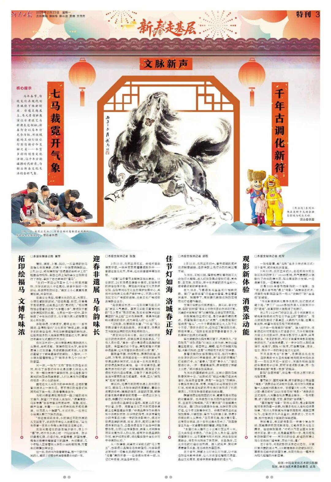 今年春节,《河南日报》版面同样不一般!2月17至2月24日,《河南日报》推出“新春八骏图”系列特刊,8天时间,8幅画作,特邀中国马文化艺术研究院副院长徐悲鸿艺术委员会委员武马倾情绘制。八匹骏马,八组现场。记者新春走基层,记录下一个个富有特点的报道现场,既有万家灯火共团圆,也有坚守拼搏在一线,既有枢纽支点之磅礴,也有欢声笑语之动人。请跟随骏马的身影,纵览中原大地的烟火人间。