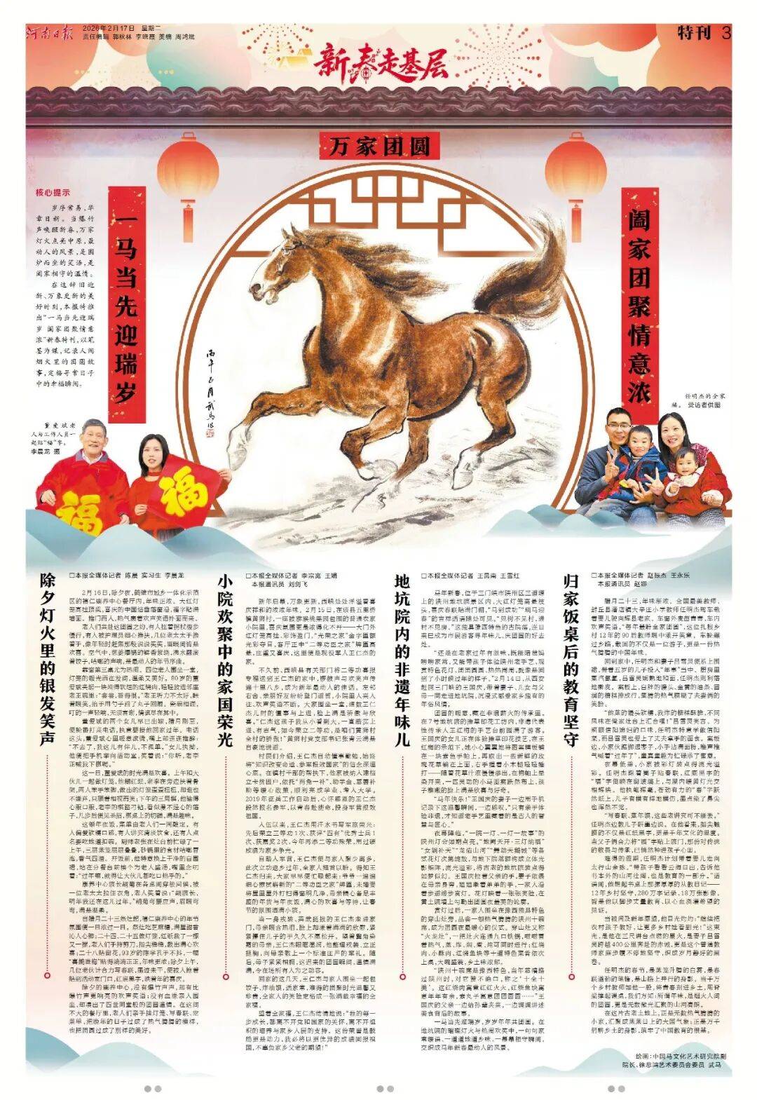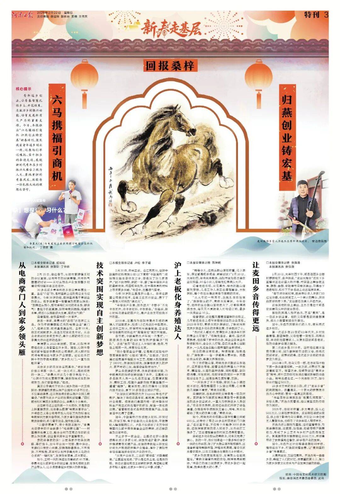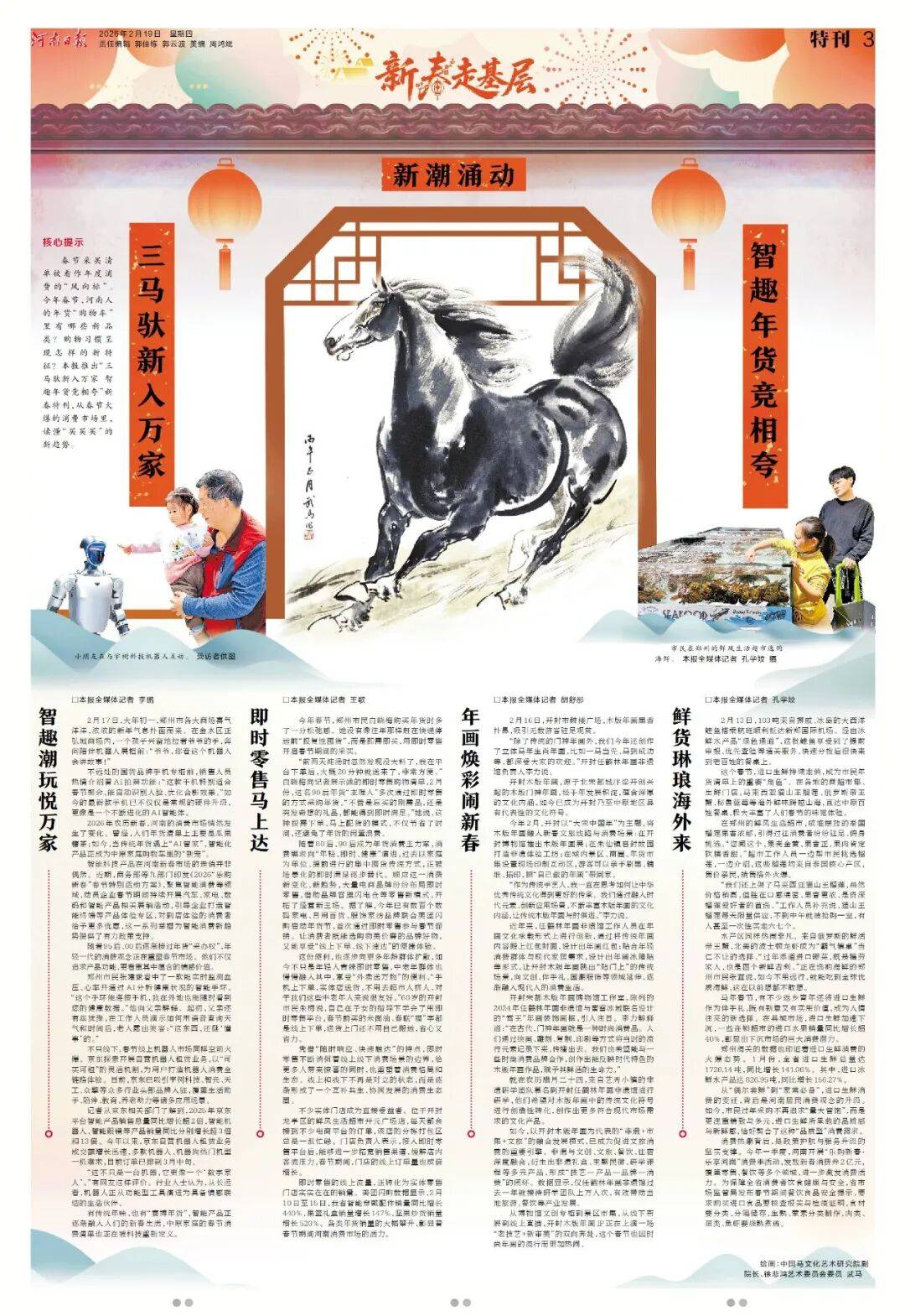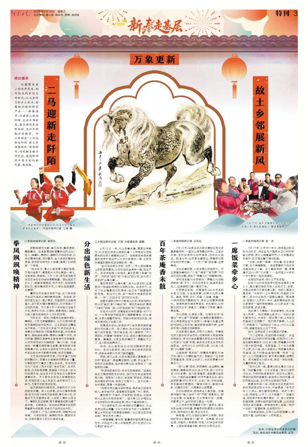 今年春节,《河南日报》版面同样不一般!2月17至2月24日,《河南日报》推出“新春八骏图”系列特刊,8天时间,8幅画作,特邀中国马文化艺术研究院副院长徐悲鸿艺术委员会委员武马倾情绘制。八匹骏马,八组现场。记者新春走基层,记录下一个个富有特点的报道现场,既有万家灯火共团圆,也有坚守拼搏在一线,既有枢纽支点之磅礴,也有欢声笑语之动人。请跟随骏马的身影,纵览中原大地的烟火人间。