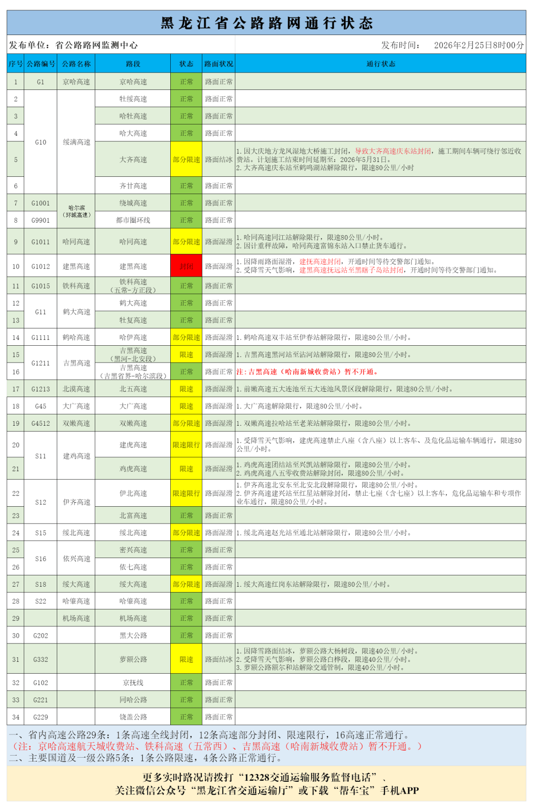 2月25日8时汇总路况信息:全线封闭的高速有(1条高速):建黑高速,封闭。部分封闭限速限行的高速有(12条高速):1.鹤哈高速(双丰至伊春站)、北漠高速、鸡虎高速、绥大高速(速红岗东站)、大广高速、吉黑高速(黑河-北安段)、哈同高速(同江站)、双嫩高速(拉哈至老莱站)、大齐高速(庆东至鹤鸣湖站)、绥北高速(赵光至通北站)、伊北高速(北安东至北安北站),限速80公里/小时。2.建虎高速,禁止八座(含八座)以上客车及危险品运输车辆通行,限速80公里/小时。3.伊北高速(建兴至红星站),禁止七座(含七座)以上客车,危化品运输车和专项作业车通行,限速80公里/小时。省内其它高速路况正常。
