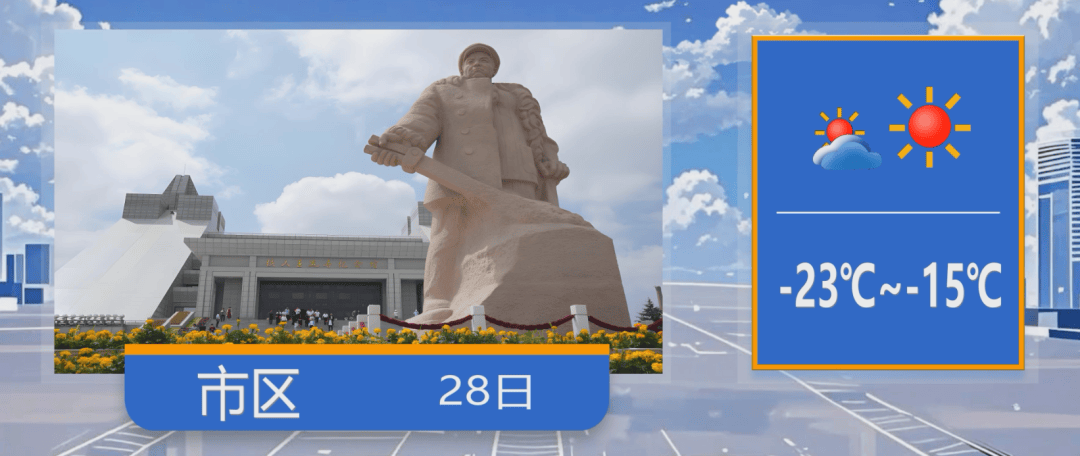 | 28 | 晴转多云 | 西北风2~3级 | -23℃ | -15℃ |