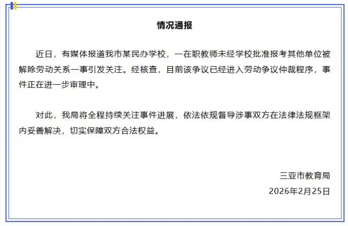 引发舆论关注后,三亚教育局公开回应,称将全程持续关注事件进展,依法依规督导涉事双方在法律法规框架内妥善解决,切实保障双方合法权益。