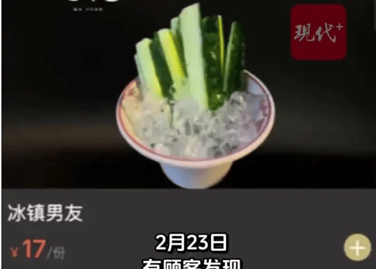 2月23日,有顾客发现,广东一网红餐厅有一道黄瓜菜品命名为“冰镇男友”,不少人认为其“擦边低俗”。2月24日,该餐厅回应现代快报记者称,的确有这样一道菜品,菜名并没有什么特殊含义,随后挂断了电话。