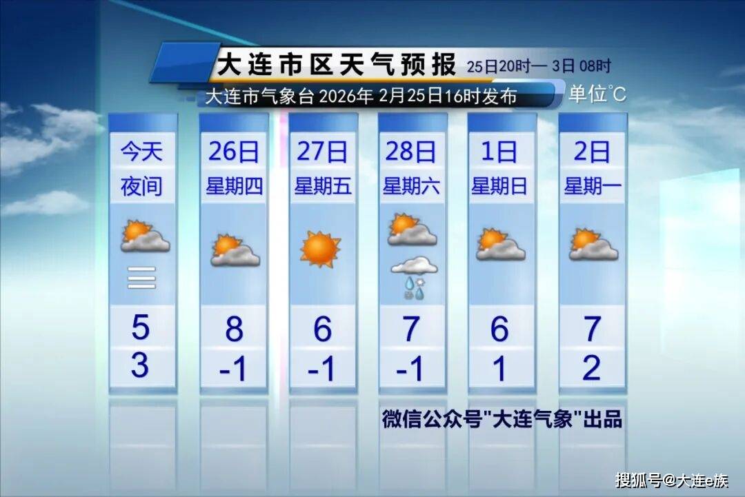 预计今天夜间雾气又将卷土重来,大连近海、沿岸及内陆部分地区有轻雾,局部浓雾,外出时一定要注意交通安全。周四、周五我市在晴和多云之间转换,受弱冷空气影响,最低气温将会下降到0℃之下,但最高气温依然维持在6~8℃。周六白天滨城天空云量将进一步增多,夜间转阴部分地区有雨夹雪或小雪,但是气温变化不大,市区的气温在-1~7℃,雨雪天气易造成道路湿滑,请注意交通安全。周日到下周一,我市以多云天气为主,气温变化不大,市区的最低气温在1~2℃,最高气温在6~7℃。