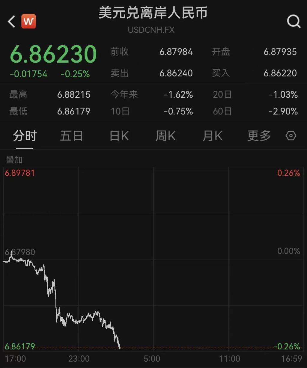 更多反映国际投资者预期的离岸人民币对美元汇率2月25日同样升破6.87关口,截至发稿,盘中最高升至6.86179,较前一交易日升值超0.25%,创下2023年4月17日以来的新高。