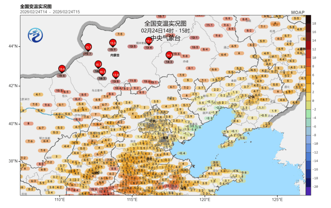 像是长春,今天气温升至9℃,明天再降至-2℃,冷暖切换非常快;石家庄今天最高气温升至15℃,随后气温下滑,28日只有3℃,气温累计降幅比较大,大家身上的厚衣服不要着急脱。