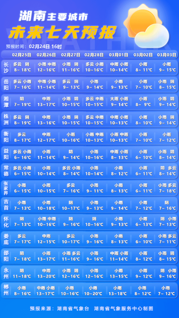 25日白天至晚上,全省阴天转小到中等阵雨或雷阵雨,其中常德、怀化北部、益阳北部、永州中部、衡阳南部、郴州北部及株洲南部局地大雨;北风2~3级,雷雨时局地阵风7~9级;最低气温湘西北8~10℃,其他地区10~13℃;最高气温14~17℃。