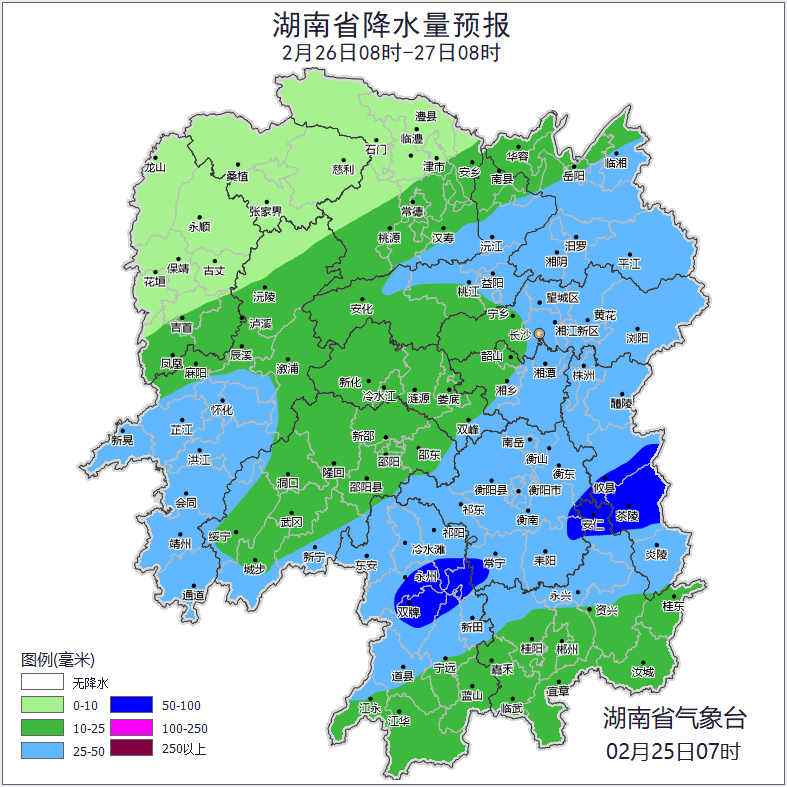 湖南省气象台预计,25日至26日,省内有一次中到大雨过程,其中湘南局地暴雨,并伴有7~9级雷暴大风、小冰雹等强对流天气。27日省内阴天为主,部分地区有小雨。25日至26日,怀化中南部、邵阳西部及娄底西部有雷雨大风气象灾害风险;永州中北部、衡阳南部、郴州北部及株洲南部有暴雨气象灾害风险。气温较常年同期偏低,26日至28日有分股冷空气渗透南下。