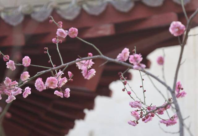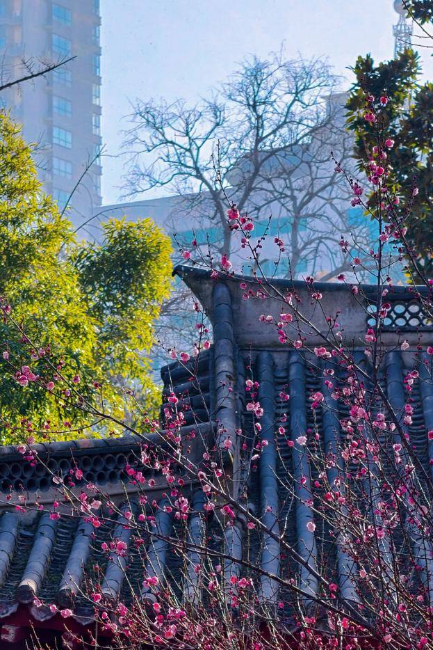 梅花枝条交错,搭配园内建筑,古韵氛围十足。建议上午10点前前往,光线柔和,梅香浓郁。