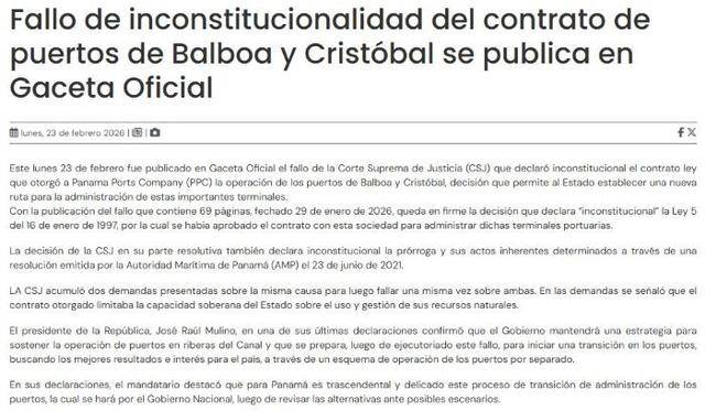 长和向本报记者透露,2月23日上午短时间内,巴拿马政府宪报先后刊登了巴拿马最高法院就1997年1月16日第5号法律原于2026年1月29日公布所作的裁决,以及巴拿马总统颁布的行政法令,该法令要求该国在所有相关政府机关之参与下,“占用”其巴拿马港口公司的“所有动产”。