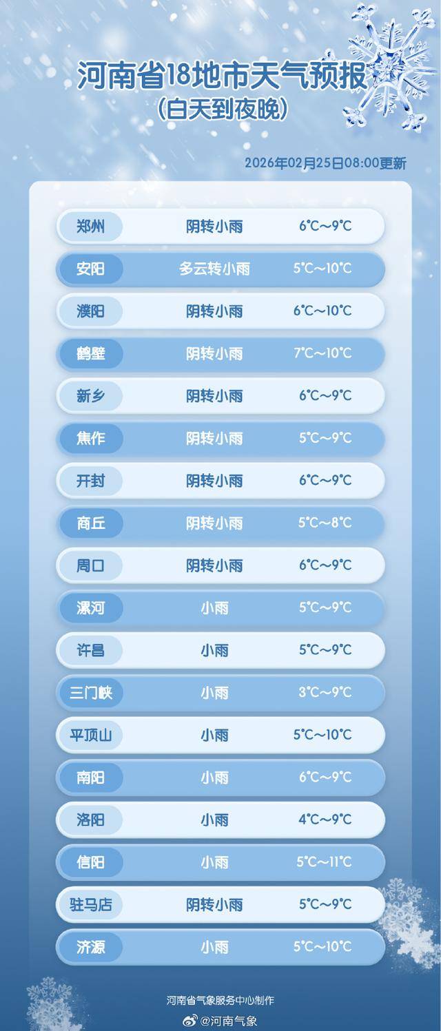 今天是2月26日,回顾昨天夜里,全省大部分地区都经历了小雨,南阳东部、驻马店南部和信阳局部雨势较强,达到了中雨级别。湿冷的空气正逐步渗透进城市的街巷。