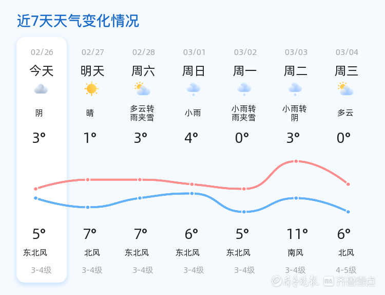 今天是2月26日,星期四,农历正月初十。烟台市迎来阴天,气温较为温和,最高气温5℃,最低气温3℃,当前温度为2.6℃,东北风1级,空气湿度63%,PM2.5指数为83。各区天气情况基本一致,均为阴天,风力较小,适合市民户外活动。不过,市民仍需注意保暖,以防感冒。