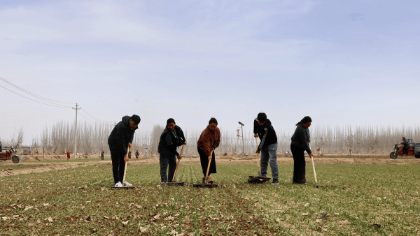 在和田市拉斯奎镇巴什拉斯奎村的农田,农户们忙碌的身影随处可见。在冬小麦田里,村民们手持锄头开展中耕划锄作业,通过疏松表土、弥合裂缝,达到保墒抗旱、促根壮蘖的效果,同时清除杂草,为弱苗转壮创造有利条件。