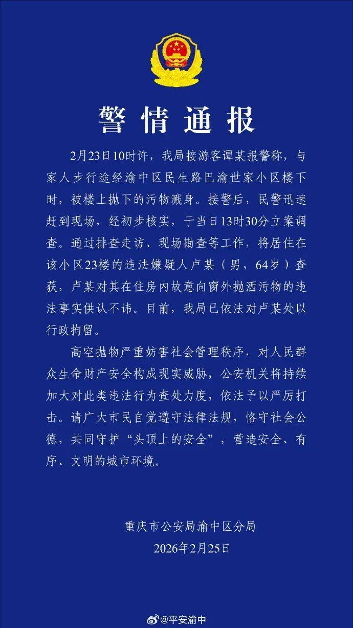 2月25日,据重庆市公安局渝中区分局通报,2月23日10时许,该局接游客谭某报警称,其与家人步行途经渝中区民生路巴渝世家小区楼下时,被楼上抛下的污物溅身。