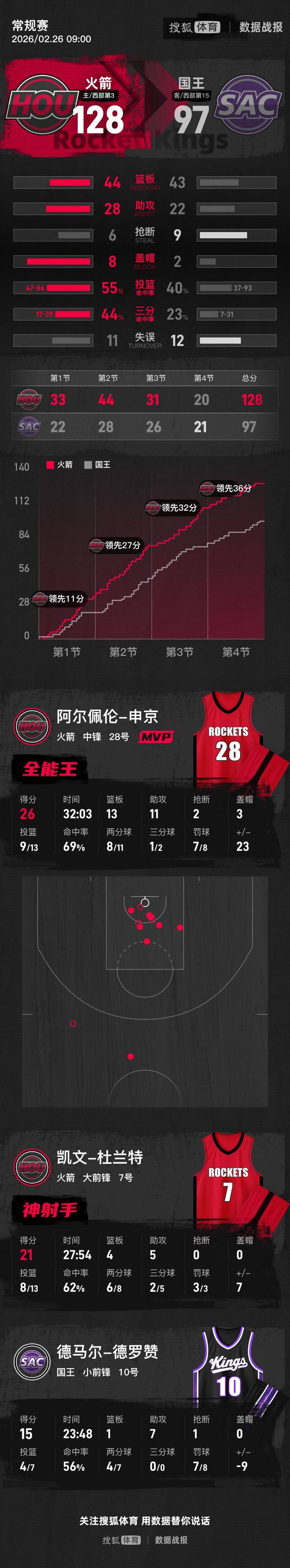 第四节,火箭在场上牢牢占据优势,始终保持大幅领先,国王在比赛中越来越难找到机会进行反击。最终,火箭以128-97赢下比赛,顺利收获胜利。