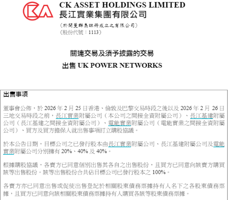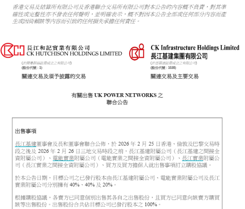 2月26日,李嘉诚旗下长和系三家公司长江基建集团、电能实业及长实集团在港交所发布公告,已与法国公用事业企业Engie旗下子公司Engie UK 2026 Limited订立协议,出售三方合共持有的英国电网公司UK Power Networks Holdings Limited 100%股权,套现逾1100亿港元。
