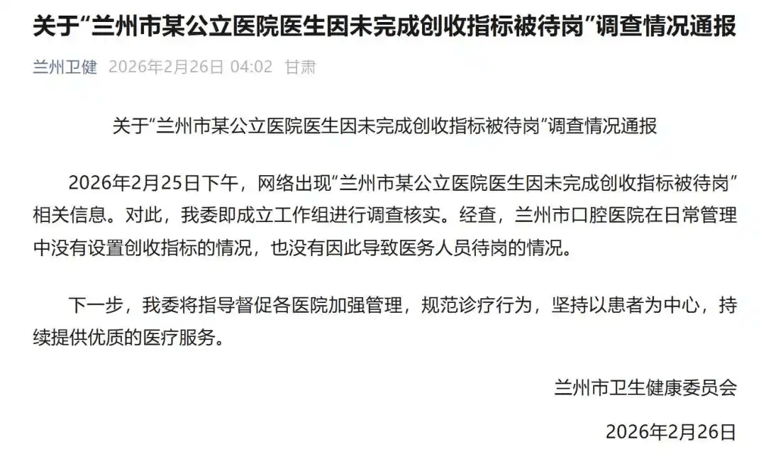 2月26日,兰州市卫健委发布通报称,经查,兰州市口腔医院在日常管理中没有设置创收指标的情况,也没有因此导致医务人员待岗的情况。