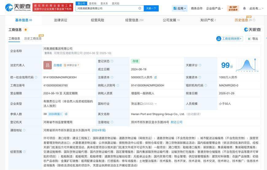 该公司成立于2024年6月,法定代表人为吕维前,经营范围含港口经营、建设工程施工、国际道路货物运输、道路货物运输、国营贸易管理货物的进出口、水路普通货物运输、港口理货、船舶港口服务、装卸搬运等,由河南交通投资集团有限公司全资持股。