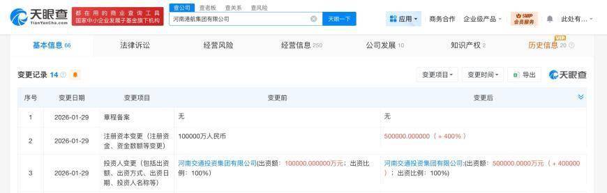 天眼查显示,近日,河南港航集团有限公司发生工商变更,注册资本由10亿人民币增至50亿人民币,增幅400%。
