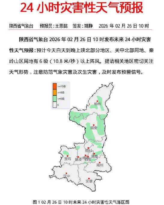 预计今天白天到晚上陕北部分地区、关中北部局地、秦岭山区局地有6级(10.8米/秒)以上阵风。提请相关地区密切关注天气形势,注意防范气象灾害及次生灾害,及时发布预警信号。