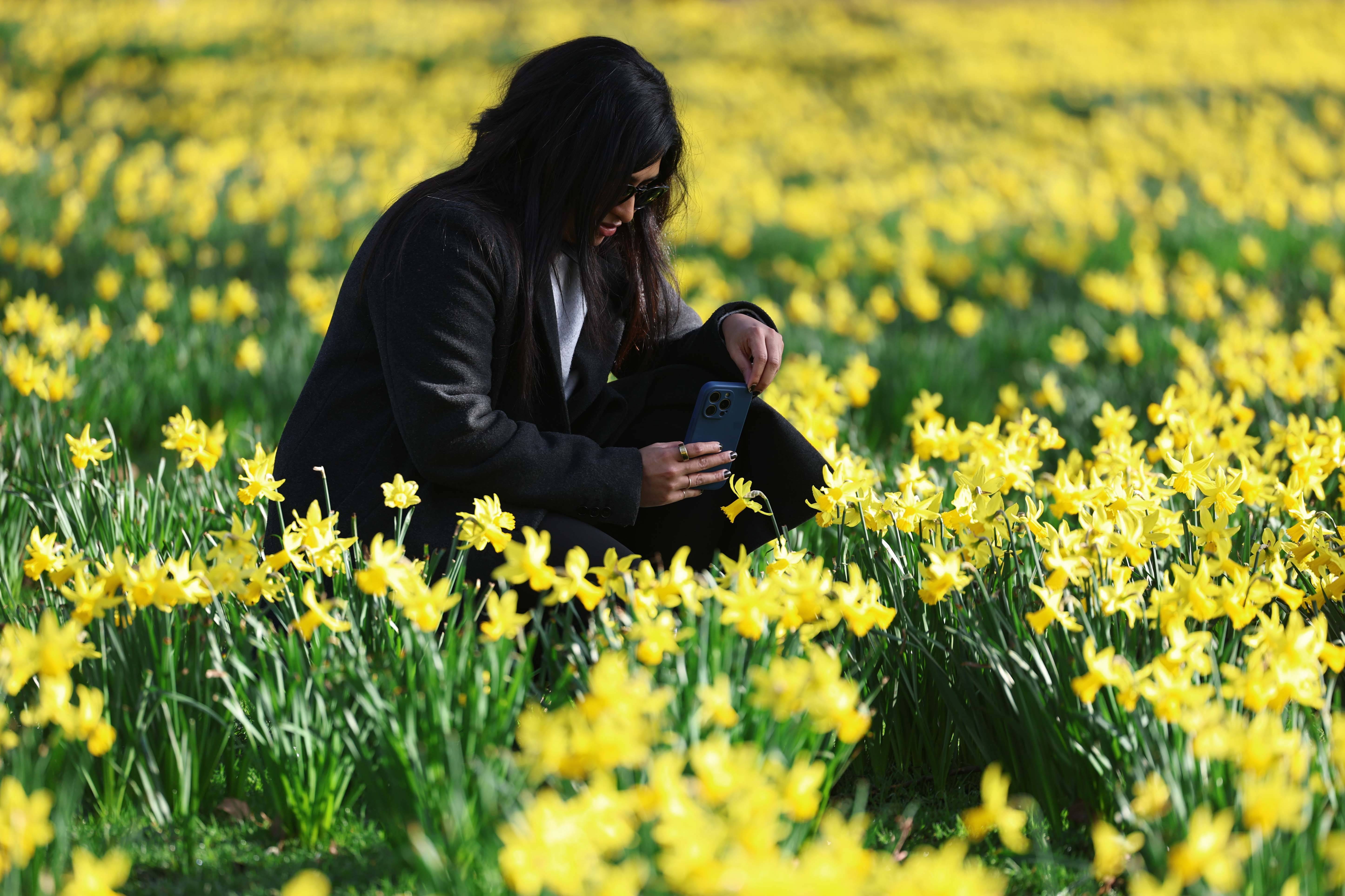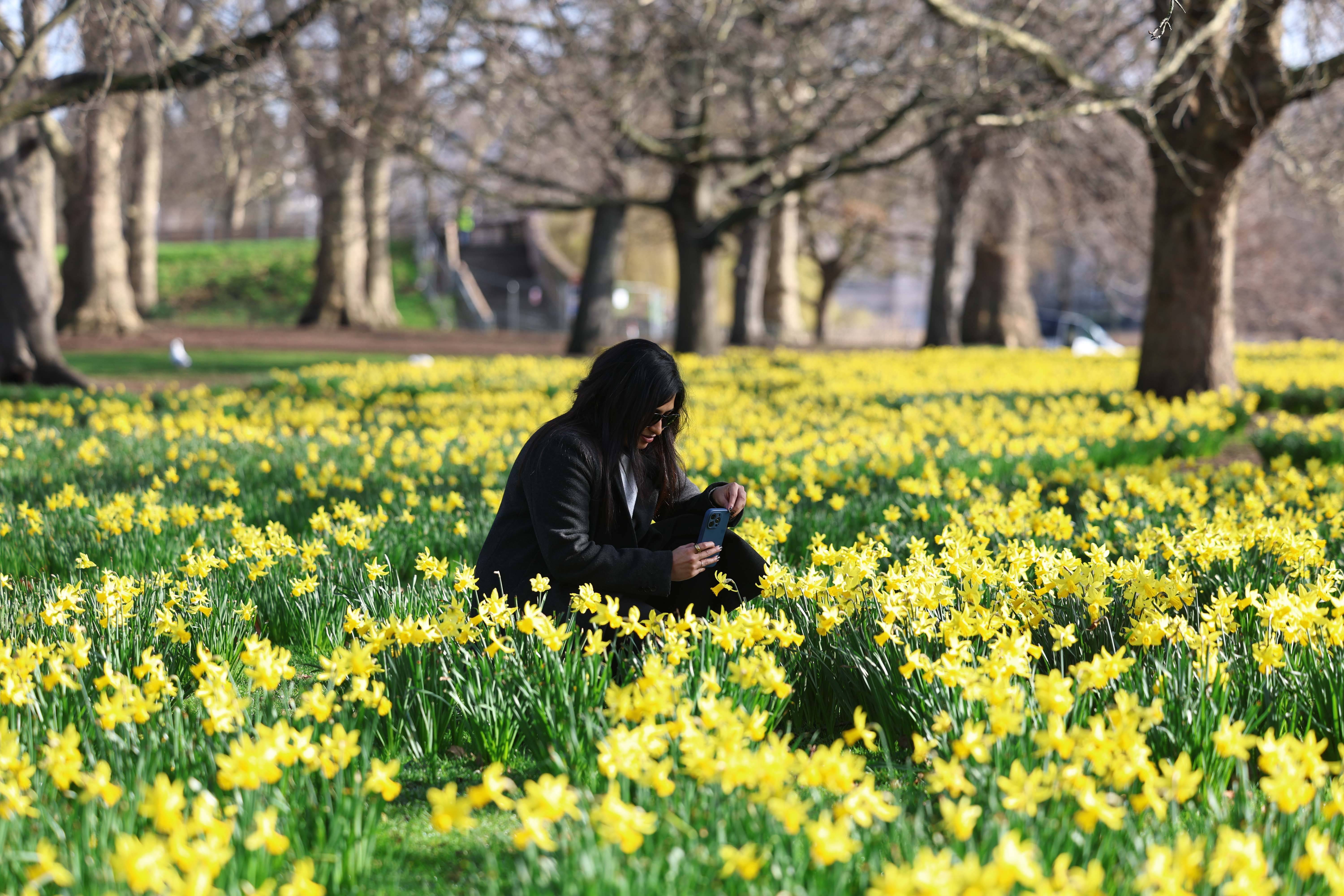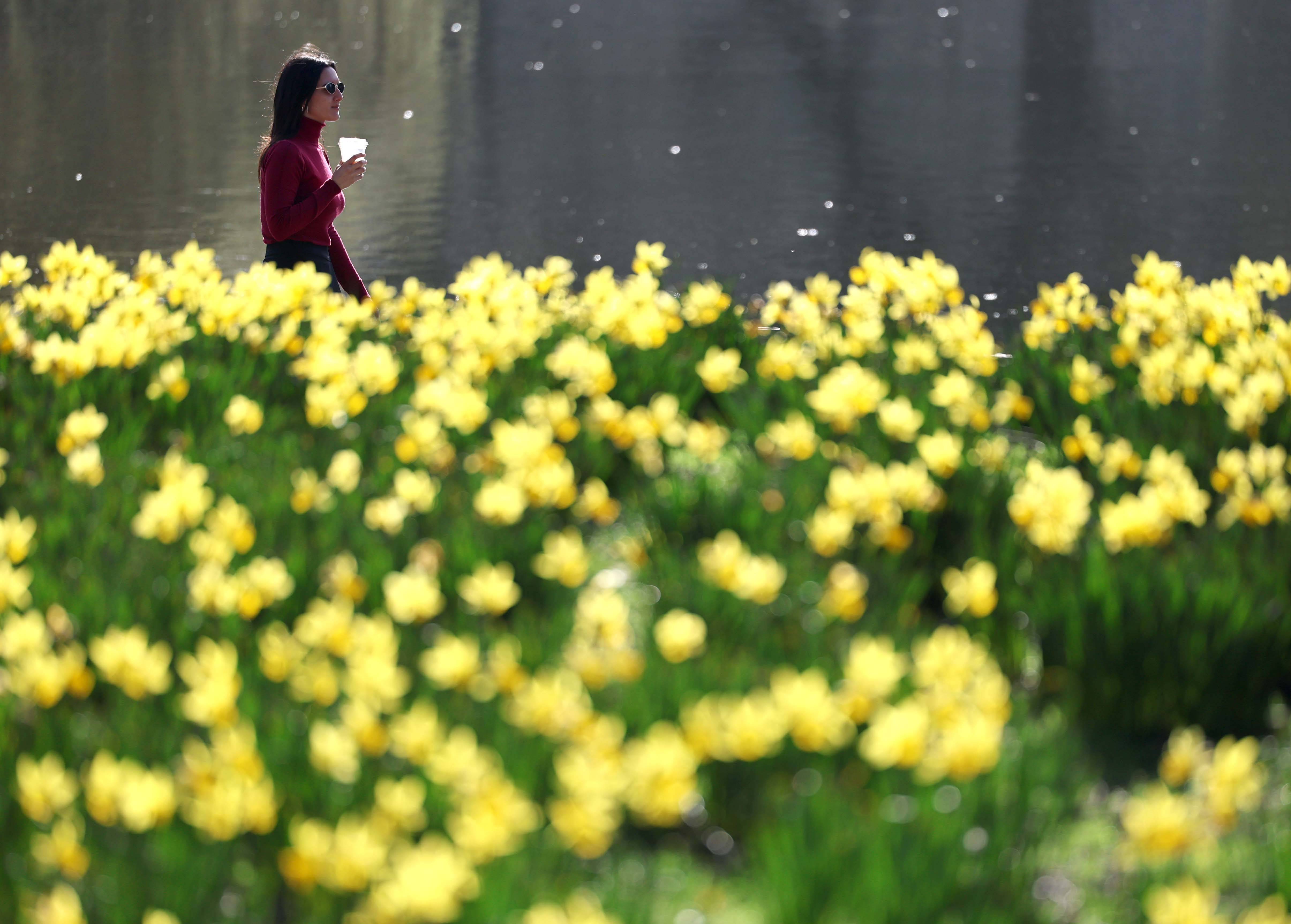 2月25日,一名女子在英国伦敦圣詹姆斯公园拍摄水仙花。 新华社/欧新