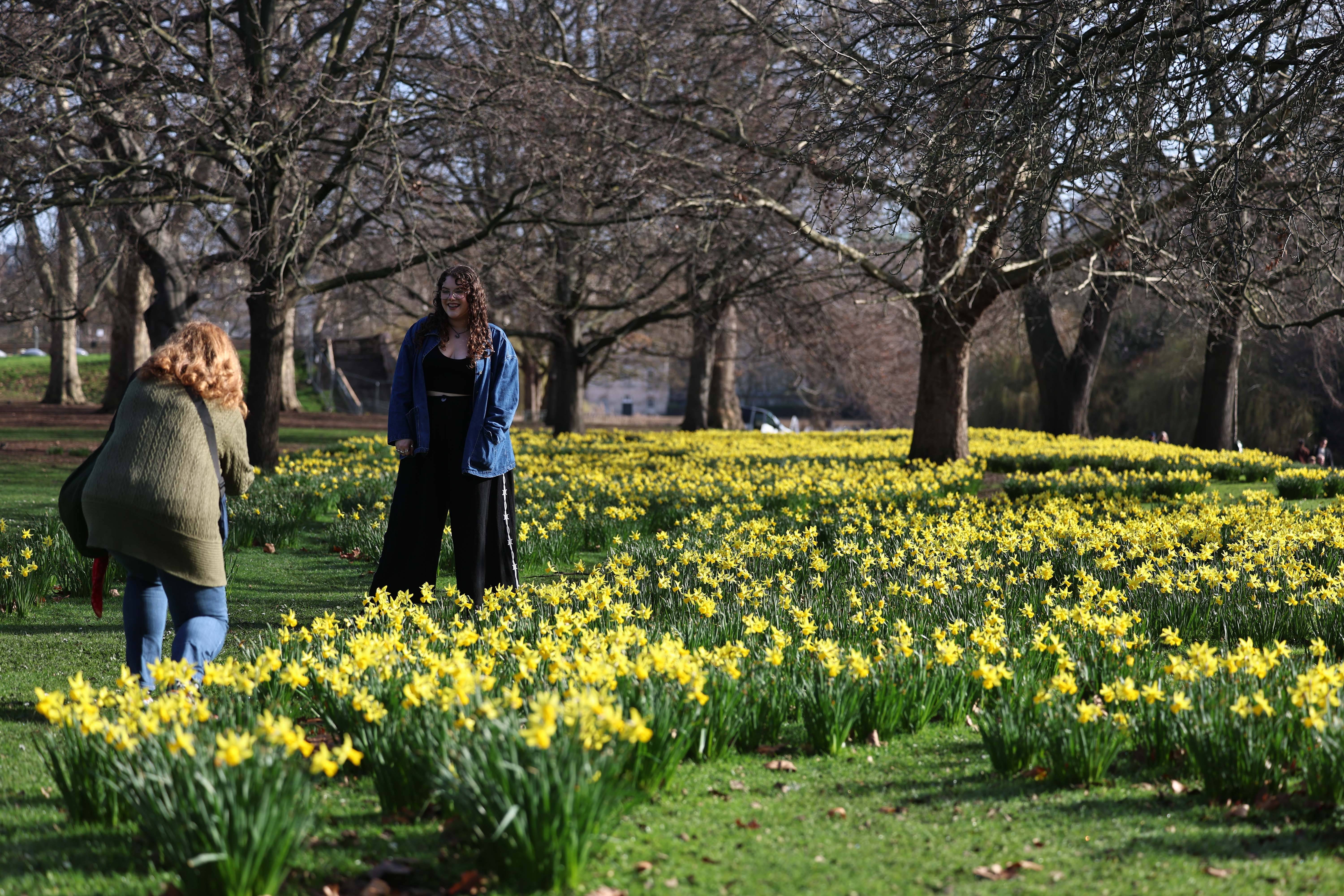 2月25日,人们走在英国伦敦圣詹姆斯公园的黄水仙花丛中。 新华社/欧新