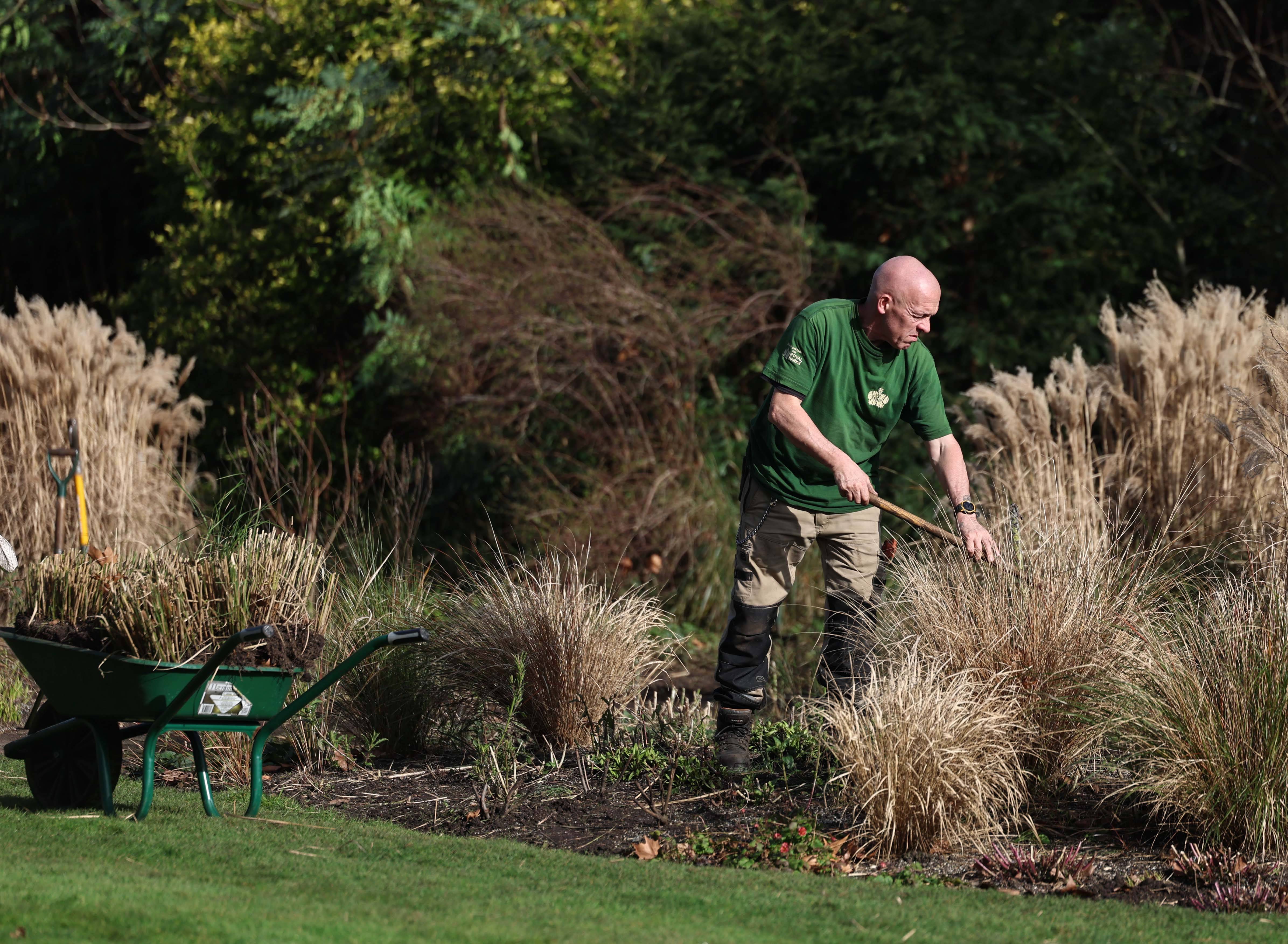 2月25日,一名男子在英国伦敦圣詹姆斯公园修剪花草。 新华社/欧新